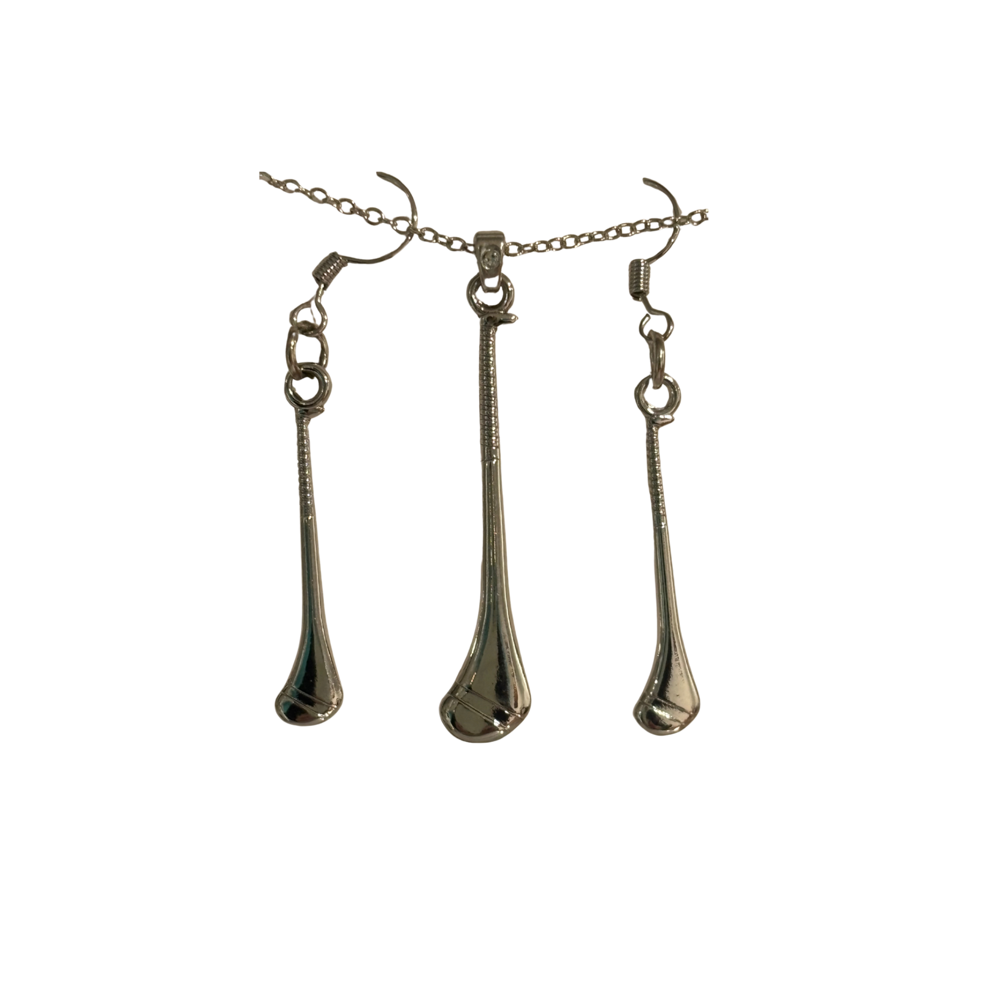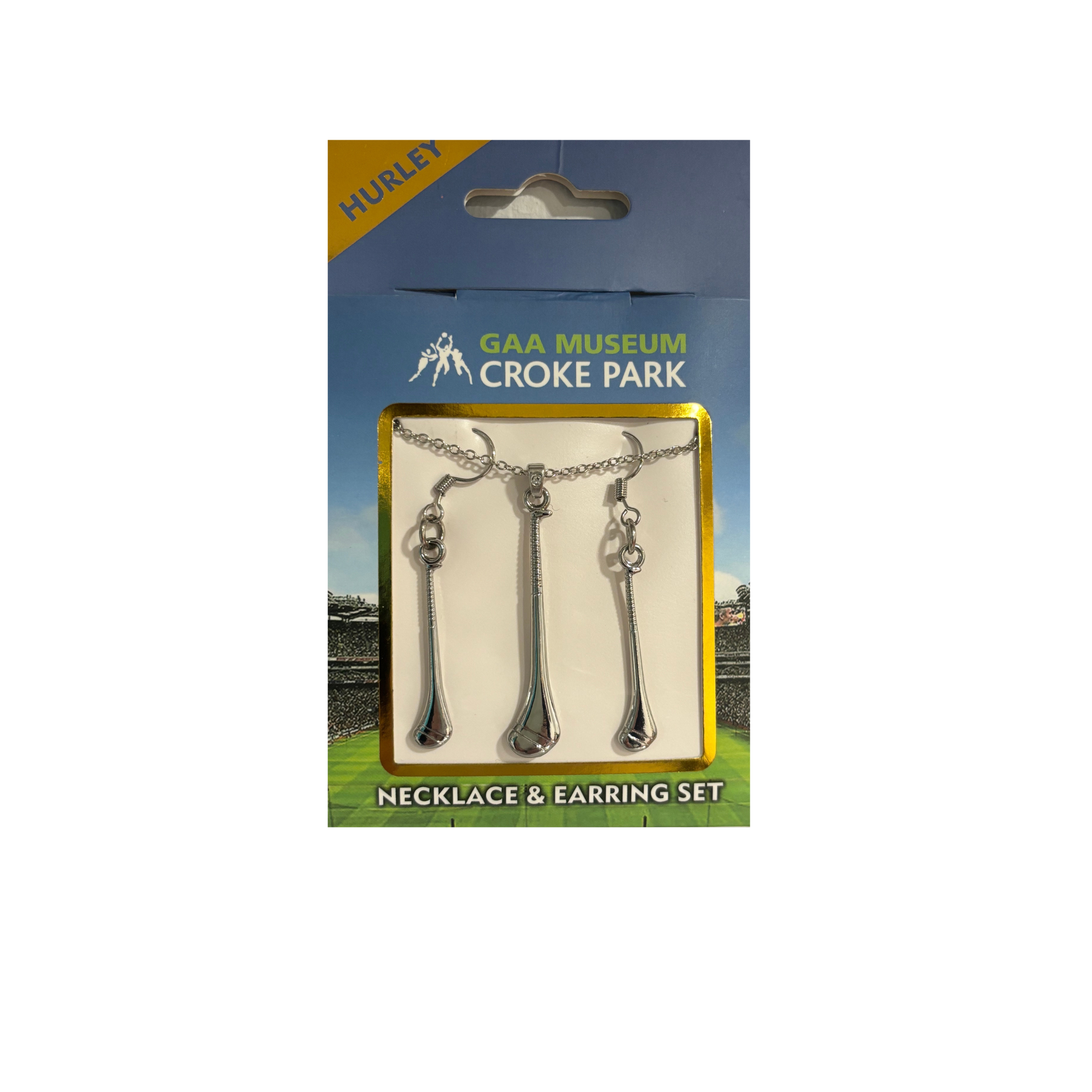 Beautiful silver-look jewellery set, comprising a necklace with a hurley charm and a pair of hurley earrings.