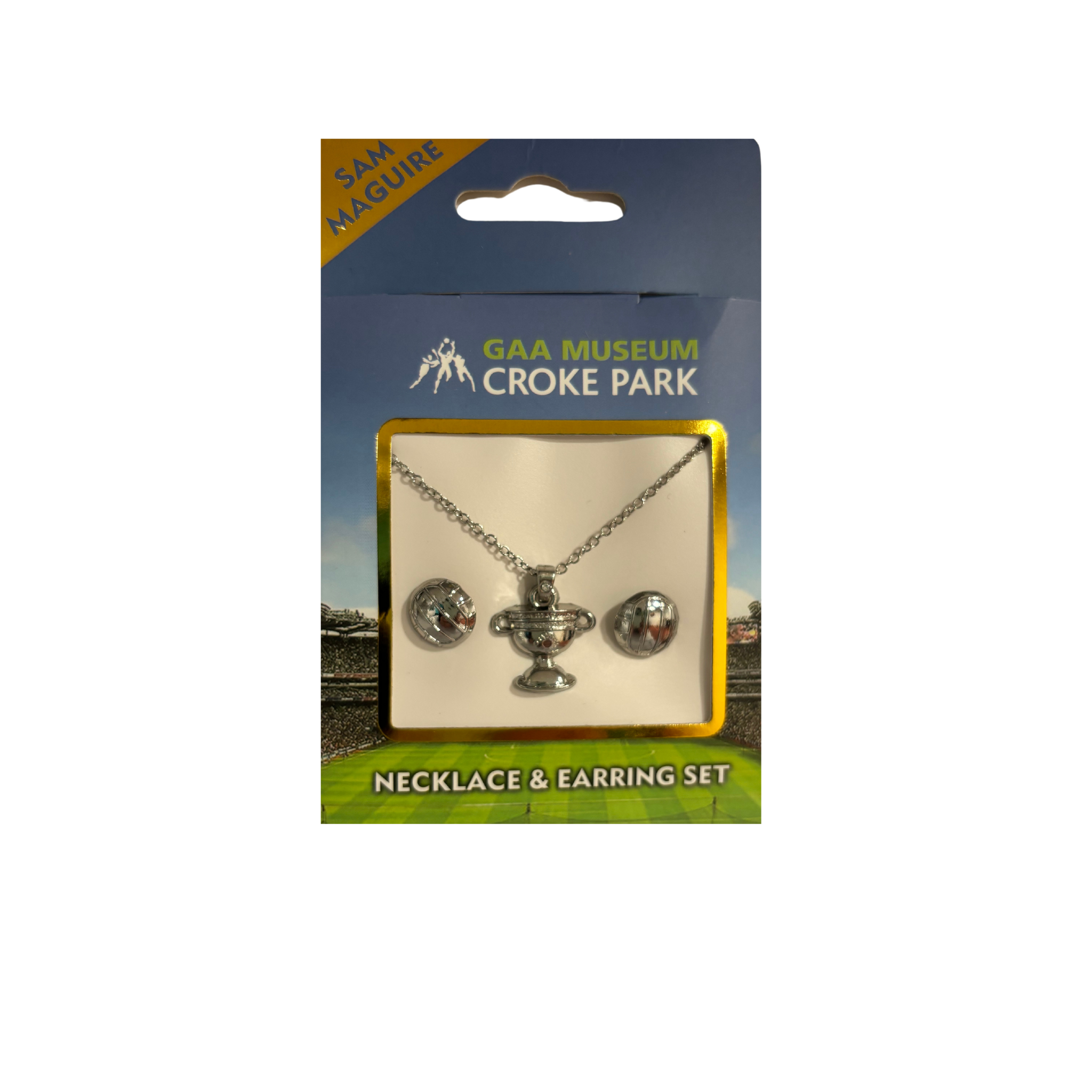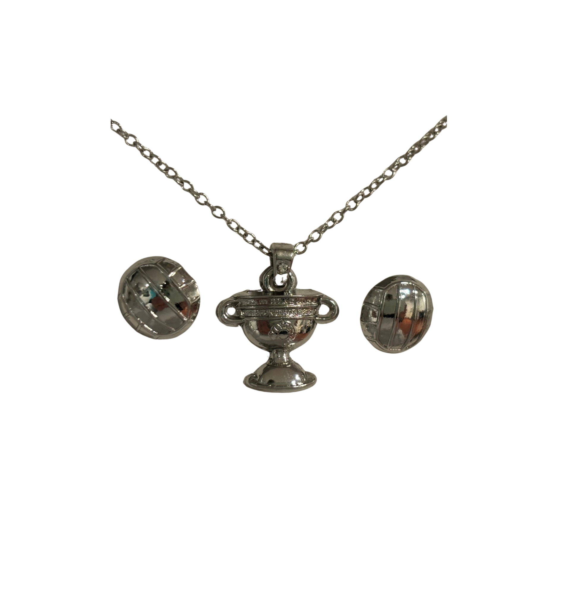 Beautiful silver-look jewellery set, comprising a necklace with Sam Maguire charm and a pair of Gaelic football earrings.