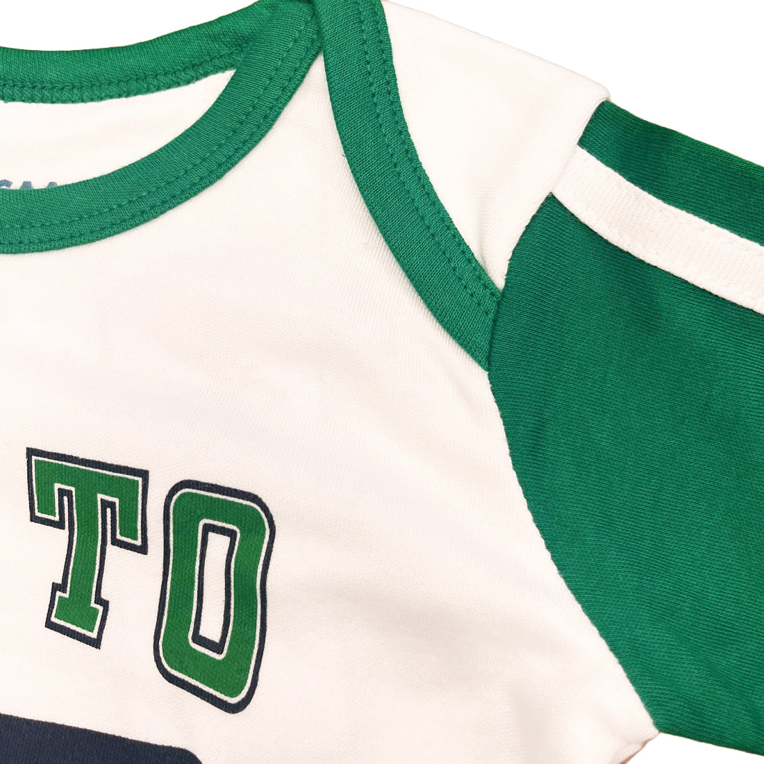 White with green and navy detailing.